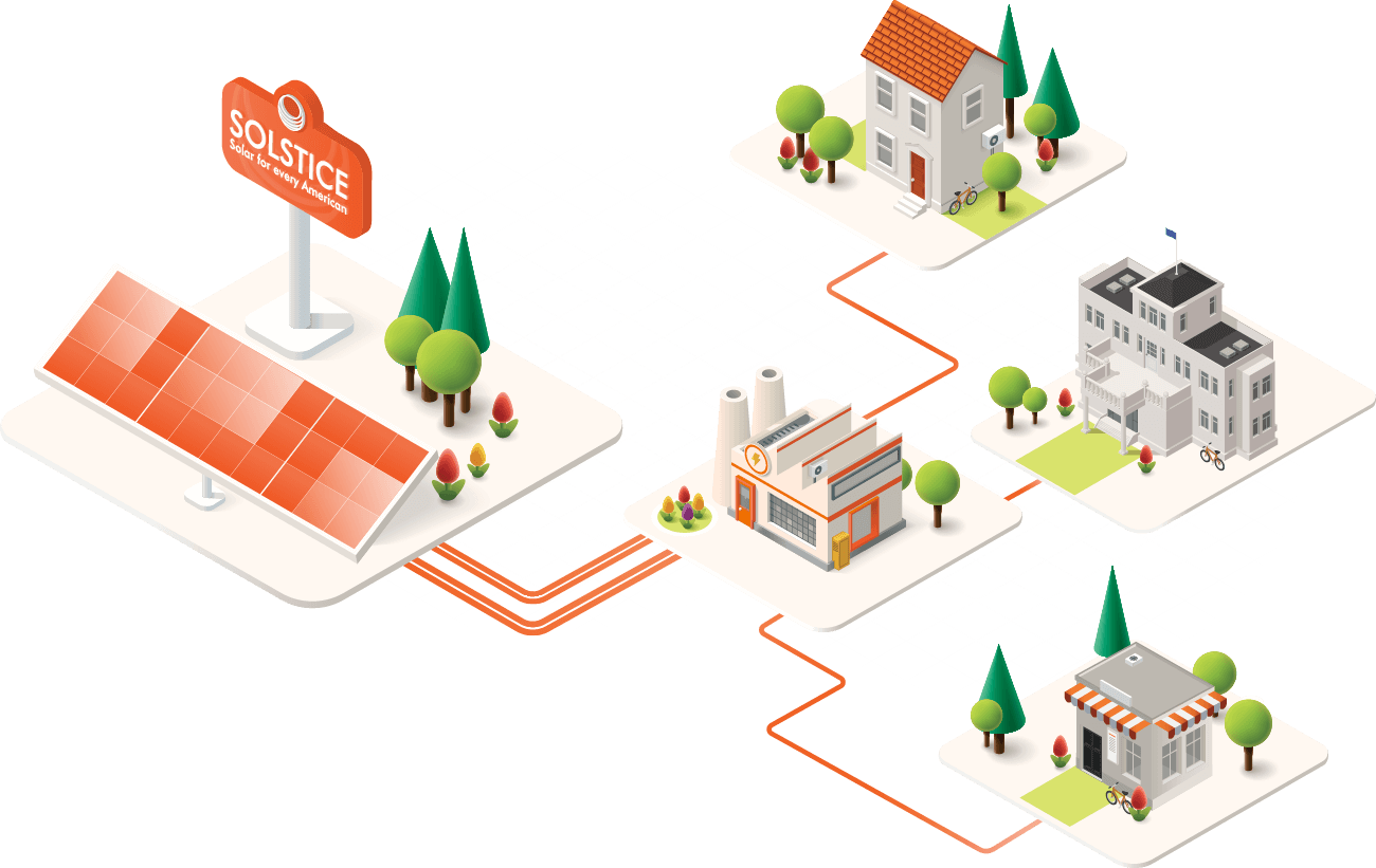 Most Americans don’t yet have the means to install solar panels on their own property. Community solar empowers residents and organizations to connect their electric meters to locally built solar farms and earn renewable energy credits on their bills, bringing down their costs and preserving their community for good.