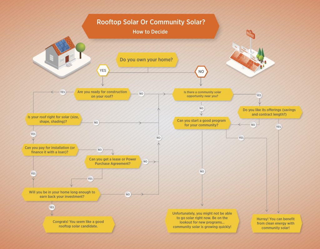 If you’ve said no anywhere along this chain–whether that was to owning your home, staying there for long enough to get paid back, or handling the burdens of your own installation–then community solar is probably the best choice for you.
