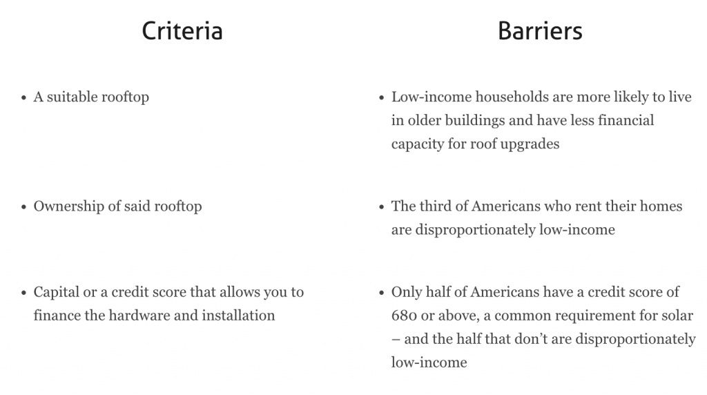 As we’ve covered extensively in past blog posts, there are generally three requirements for households looking to install rooftop solar, and all three can act as barriers to lower-income households: