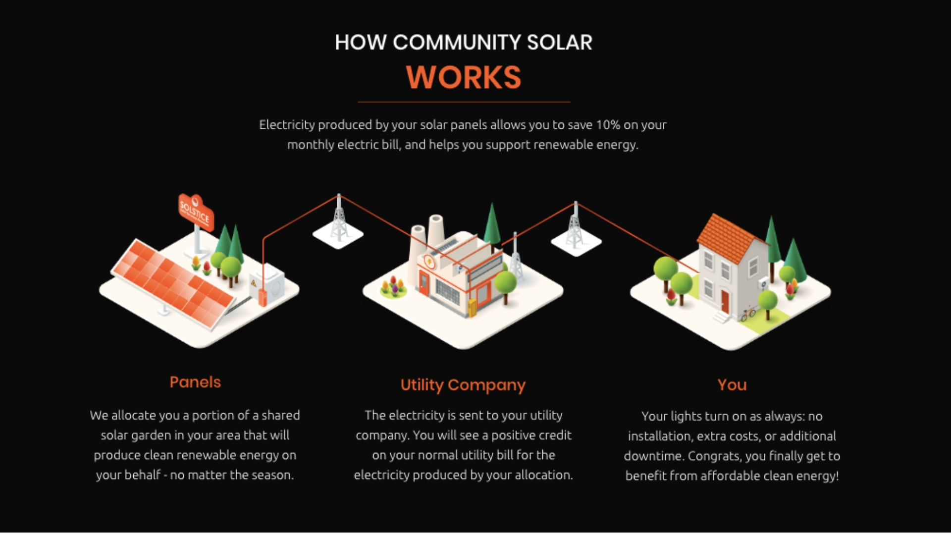 Here’s how it works: customers who enroll in community solar earn “solar credits” on their bills, giving them a discount every month. Picture rooftop solar: your solar panels produce energy, your utility gives you credits for that power, and you save money.